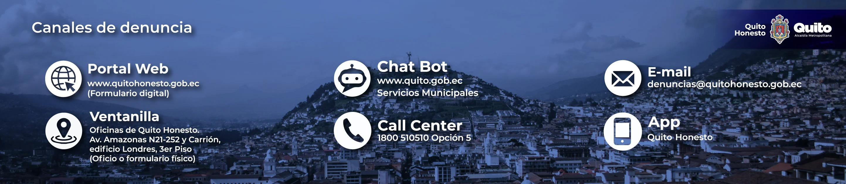 Quito Honesto es una institución ciudadana comprometida con la transparencia y la lucha contra la corrupción en el Distrito Metropolitano de Quito. Está liderada por un representante del Alcalde e integrada por cuatro miembros provenientes de universidades, la Cámara de la Construcción / Colegios Profesionales, la Cámara de la Producción y la sociedad civil. Su objetivo principal es servir a la ciudadanía con integridad y responsabilidad.